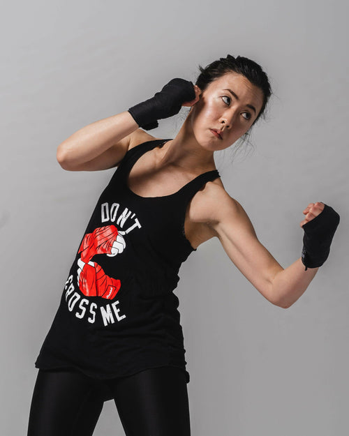 The 'Don't Cross Me' tank is made of 70% rayon bamboo, 25% cotton, and 5% spandex. Made of light, breathable fabric that doesn't hinder your movement; this tank speaks for itself.