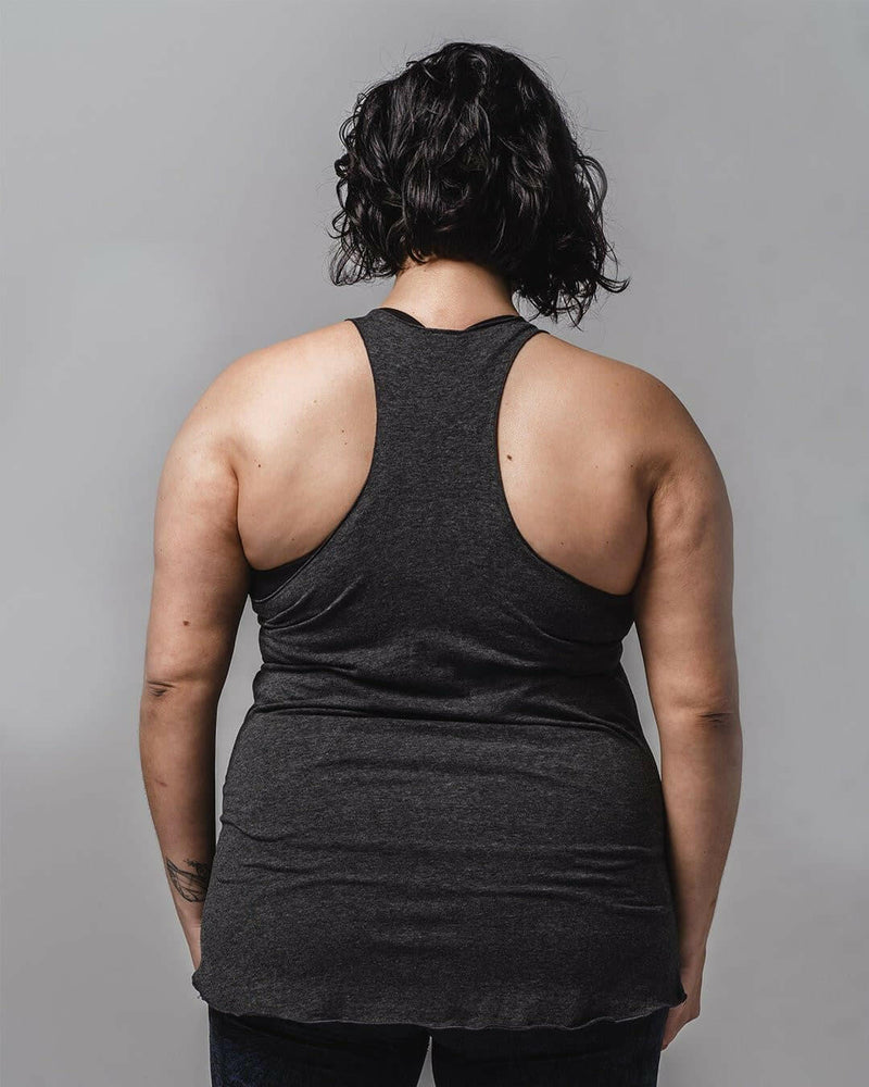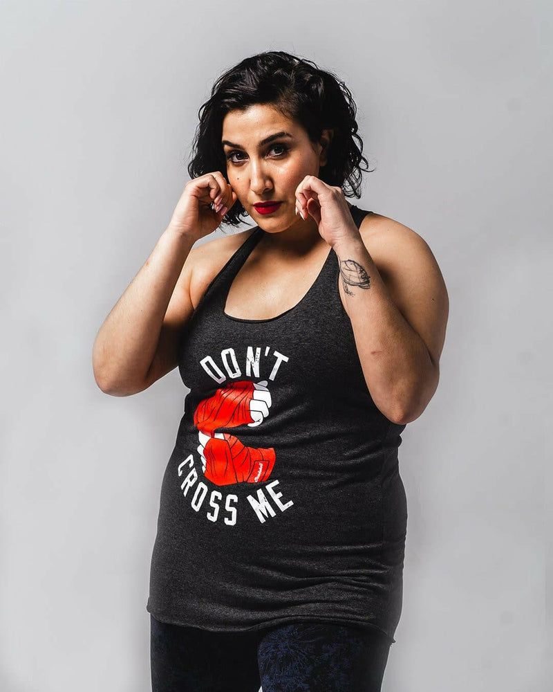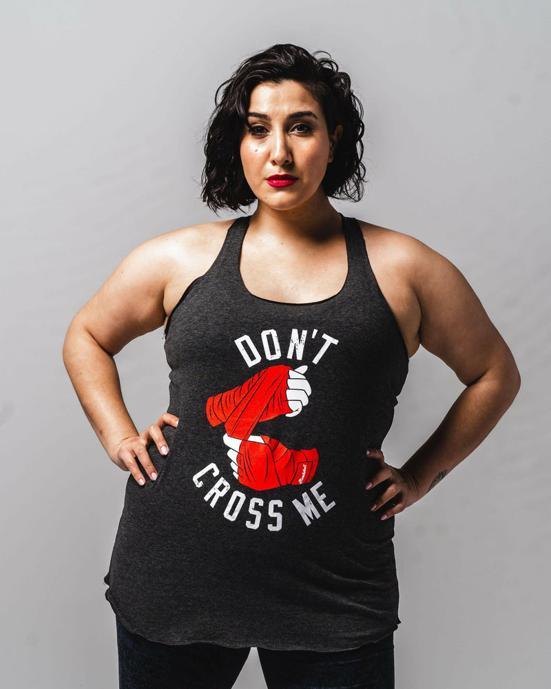 The 'Don't Cross Me' tank is made of 70% rayon bamboo, 25% cotton, and 5% spandex. Made of light, breathable fabric that doesn't hinder your movement; this tank speaks for itself.