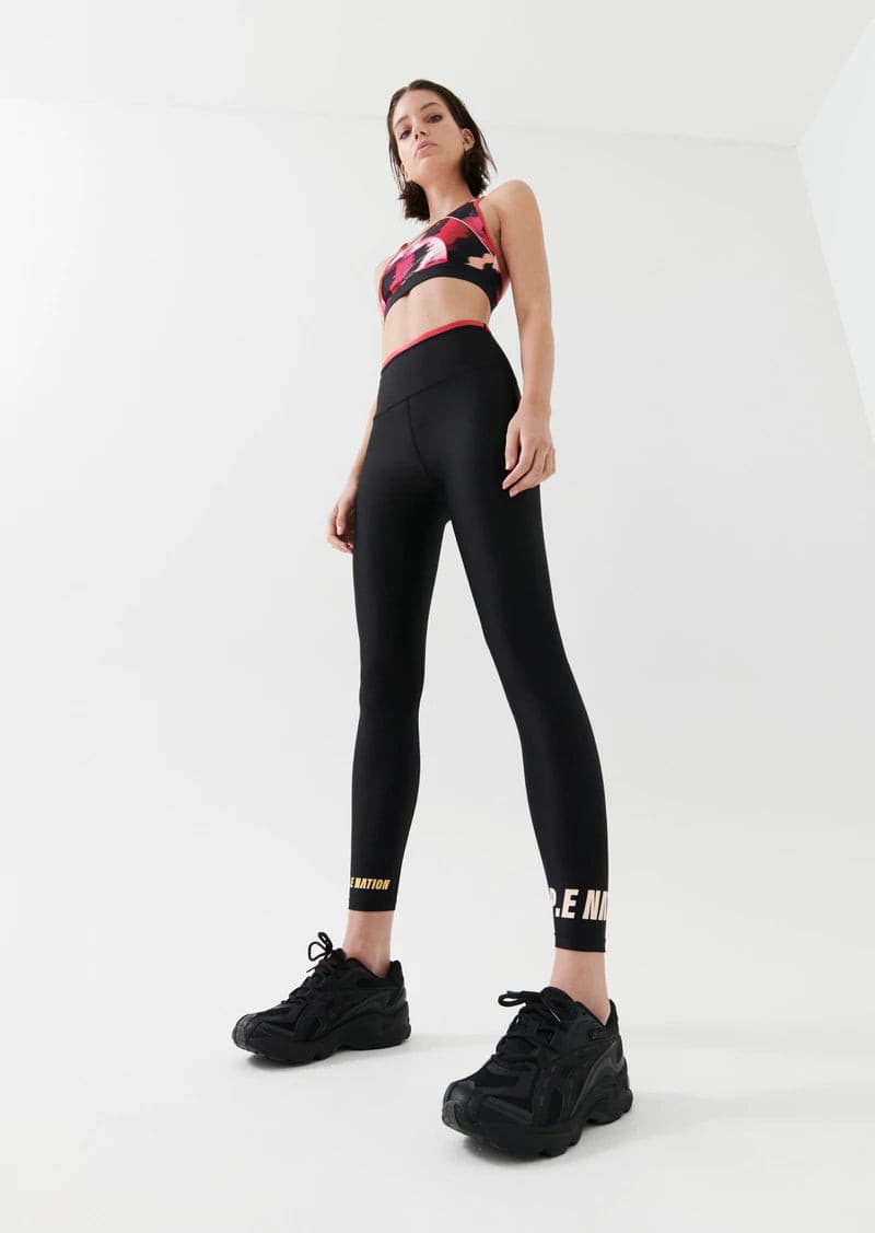 The Double Under Legging in Black comes as part of our It’s All In Me Collection. Designed to support high-intensity training including running and HIIT sessions, the Double Under Legging is a high-rise, 7/8 length style with built-in waistband support and contrast pink colour block detail on the trim. An all-black colourway is complemented by gold foil P.E Nation logos on the right lower leg, and pale blush P.E Nation logos on the opposite. Team it up with the High Press Sports Bra, Fluid Sports Bra or One Shot Tee depending on the intensity of your workout.