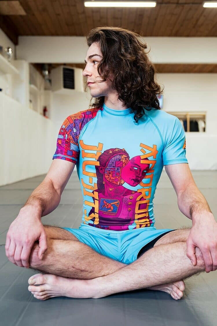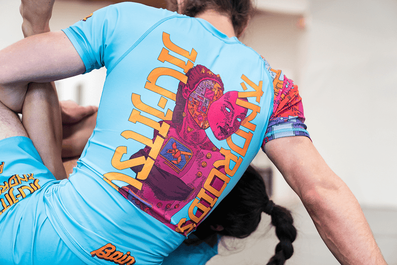 Roll into Summer with this new super vibrant rashguard. Jiu-Jitsu Androids make for great training partners, no need to worry about sweat or wild uncontrolled movements, you can even set their ability level depending on how you feel on any given session. Just make sure to ALWAYS turn them off after use, BAIN is not responsible for any damages resulting from the misuse or abuse of our AI overlords super fun training partners…
